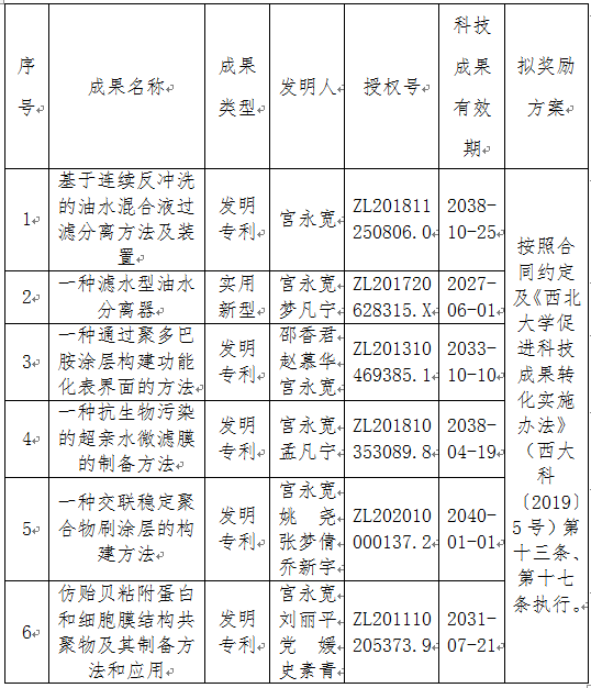 根据《球友会网页版登录入口促进科技成果转化实施办法》(西大科〔2019〕5号)相关规定,经学校科技成果转化工作小组、校长办公会审议,校党委常委会审定,拟对球友会网页版登录入口化材学院宫永宽教授作为成果负责人的6项专利(5项发明专利和1项实用新型专利)权实施独占许可,现将相关信息公示如下: