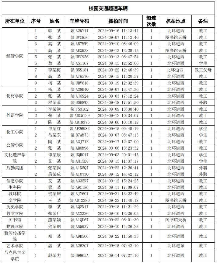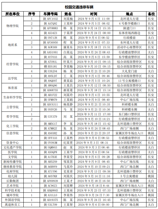 为一步加强校园交通管理,保障校园交通安全有序,维护学校正常的教学、科研和生活秩序以及师生员工的人身财产安全,根据《球友会网页版登录入口校园交通安全管理规定》有关要求, 现将2024年9月校园交通违章车辆予以曝光,具体情况如下表。